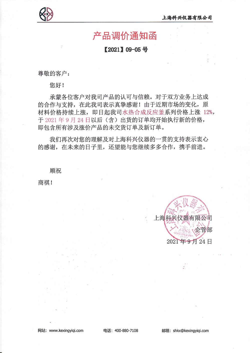 承蒙各位客戶對我司產(chǎn)品的認(rèn)可與信賴。對于雙方業(yè)務(wù)上達(dá)成的合作與支持,在此我司表示真摯感謝!由于近期市場的變化,原材料價(jià)格持續(xù)上漲,即日起我司水熱合成反應(yīng)釜系列價(jià)格上漲 12%,于 2021 年 9 月 24 日以后(含)出貨的訂單均開始執(zhí)行新的價(jià)格,既包含所有涉及漲價(jià)產(chǎn)品的未交貨訂單及新訂單。