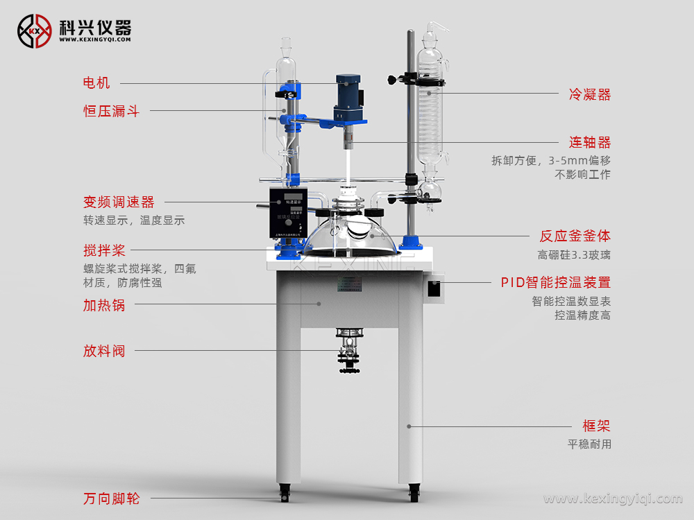 該系列反應(yīng)釜是我公司根據(jù)客戶實(shí)際需要及規(guī)定標(biāo)準(zhǔn)的新型單層玻璃反應(yīng)釜,其吸收了國(guó)內(nèi)外同類(lèi)產(chǎn)品的優(yōu)點(diǎn),同時(shí)大膽創(chuàng)新,不僅使用方便(可一人方便移動(dòng),操作,清洗,安裝,拆卸),而且結(jié)構(gòu)新穎實(shí)用,外形美觀大方;誠(chéng)為現(xiàn)代化學(xué),精細(xì)化工,生物制藥,新材料合成等試驗(yàn)及生產(chǎn)的理想設(shè)備。該反應(yīng)釜工作原理:玻璃反應(yīng)釜內(nèi)放反應(yīng)物料,同時(shí)可抽真空做攪拌反應(yīng);外部水(油)浴鍋可加水或加熱油進(jìn)行加熱反應(yīng);并能控制反應(yīng)溶液的蒸發(fā)和回流,恒壓加料等功能。(可選配制冷組件,配合制冷源進(jìn)行低溫反應(yīng))